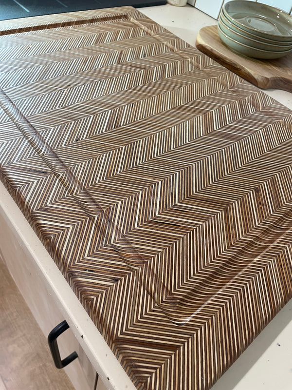 End grain birch plywood, patterned chopping, serving or charcuterie boards made to order.